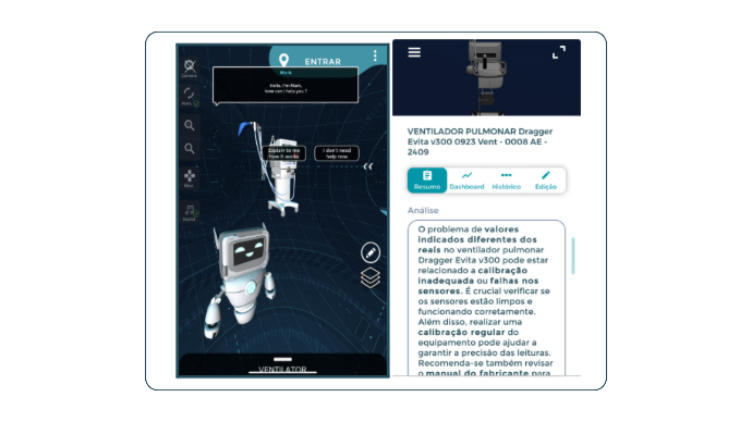 Imagine que um ventilador pulmonar apresenta variações no fluxo de ar durante a ventilação. O Gêmeo Digital identifica as oscilações nos parâmetros de pressão e volume, enquanto a IA sugere ações corretivas e simula diferentes cenários para garantir o ajuste ideal. Simultaneamente, uma ordem de serviço é gerada no CMMS, notificando um técnico em tempo real para realizar a intervenção. Resultado: maior segurança para o paciente, continuidade no suporte vital e redução de custos operacionais.